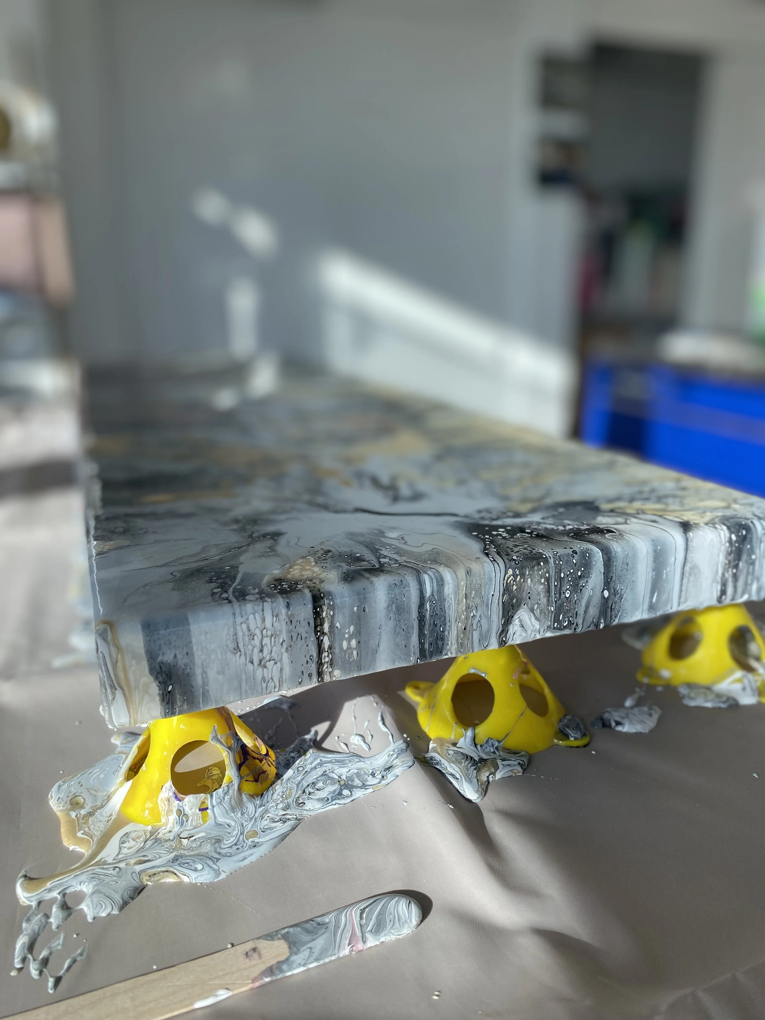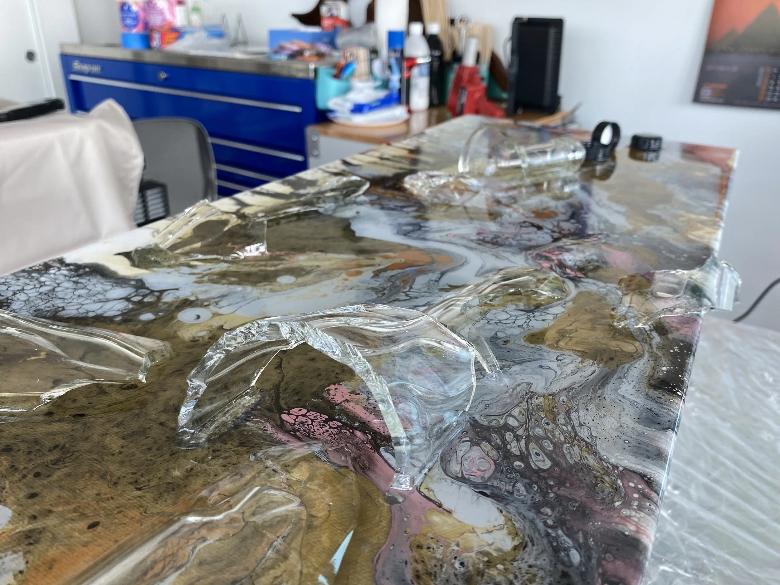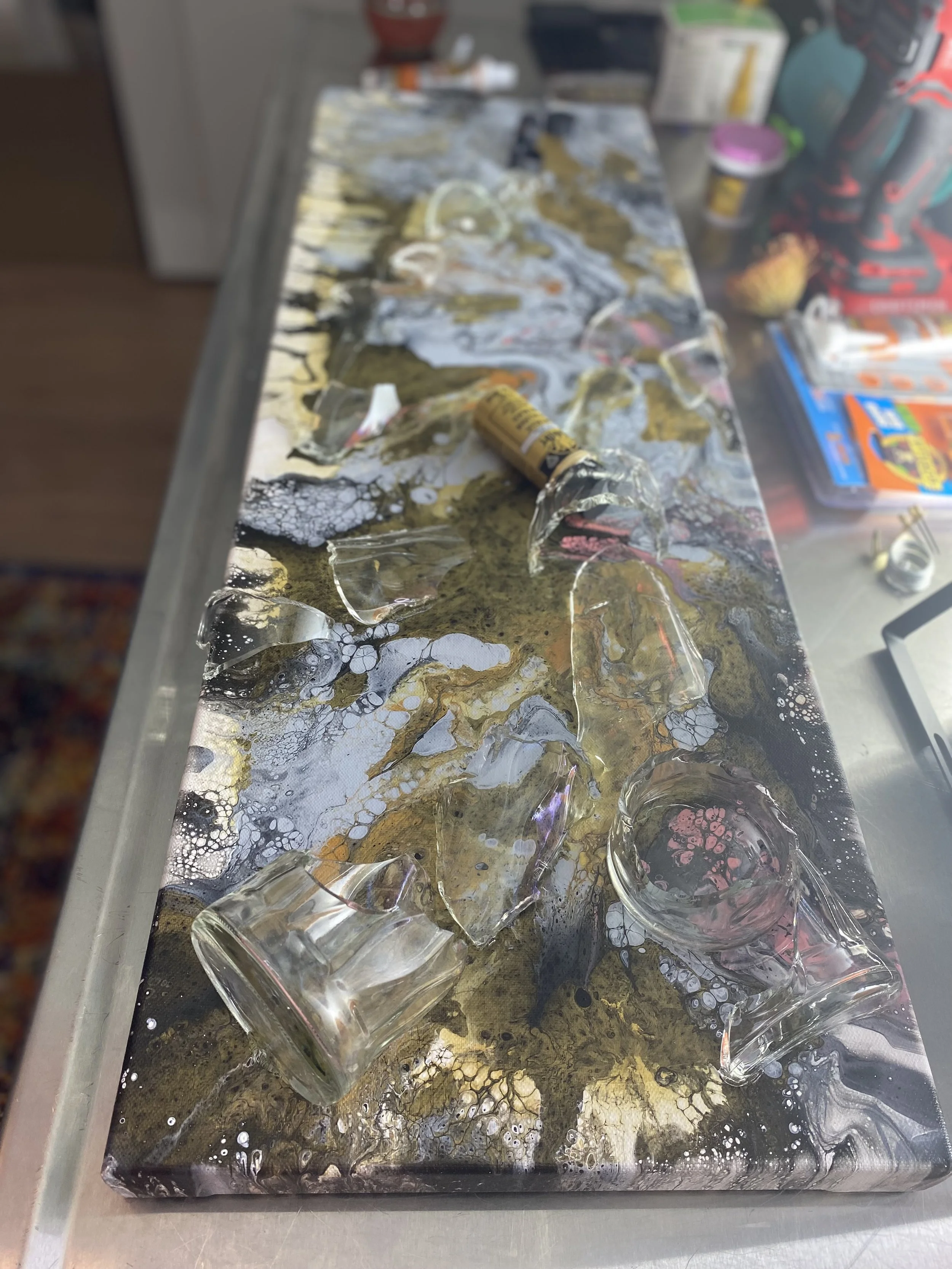 This mixed media piece captures the raw journey of healing from alcoholism. Fluid metallics swirl beneath a glossy resin surface, symbolizing the emotional turbulence of addiction. Jagged glass breaks through the calm, representing both the pain of collapse and the power of transformation. The contrast of chaos and clarity reflects a path from destruction toward renewal—a visual echo of breaking, rebuilding, and becoming whole again.